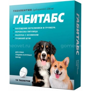 ГАБИТАБС 200 мг (10 таб) применяют для устранения поведенческих расстройств, купирования повышенной тревожности, в том числе при проведении диагностических исследований, транспортировке и груминге у собак и кошек.