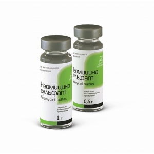 НЕОМИЦИНА СУЛЬФАТ — лекарственное средство в форме порошка для лечения бактериальных инфекций желудочно-кишечного тракта молодняка сельскохозяйственных животных, включая птиц, с активностью не менее 680 мкг/мг (в пересчете на сухое вещество). НЕОМИЦИНА СУЛЬФАТ представляет собой порошок от желтовато-белого до светло-коричневого цвета, легкорастворимый в воде, расфасованный по 50, 100, 200, 330, 500, 1000, 5000 и 10000 г в двойных полиэтиленовых пакетах, пакетах из бумаги с полиэтиленовым покрытием, пластиковых банках или пластиковых ведрах.